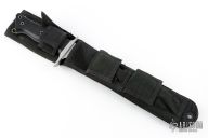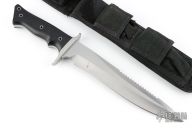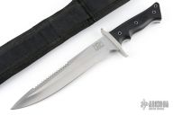 This Model 2 by Walter Brend features a double hollow ground blade with a matte finish and sawteeth on the spine as well as a sharpened top edge, .324" blade stock and 1.634" blade depth, full tang construction. The handle has a matte finished titanium double guard, and black linen micarta scales, hollow tube pins and lanyard hole. Comes with a black nylon sheath. This knife is beautiful and sports the "Walterboro SC" logo. Has some light scratches and oxidation spots, has been sharpened, otherwise good condition.