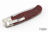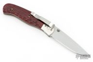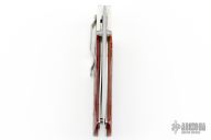 This Linerlock by Ricky Fowler features a bead blast finished blade with dual thumbstuds. The handle has polished stainless steel bolsters, jigged bone scales, and satin posts. Nice detent, lockup and blade seating. Has some light scuffs, great condition otherwise. Marked Susan Fowler, either made by or for Ricky's wife. Comes with a nylon belt sheath.