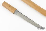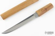 This Japanese Tanto features a hand rub satin finished blade with light hamon, .168" blade stock and .915" blade depth, hidden takedown tang construction. The handle and saya are wood. Has a few light scratches, otherwise excellent condition. There are no markings on the tang of the blade. Comes with a zippered case.