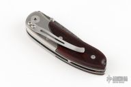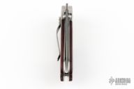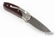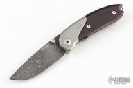 This small folder by Lion Steel features a Damascus blade with notched thumbrest and dual thumbstuds. The handle has titanium bolsters, wood scales, stainless steel liners and tip down clip. Has a few light scuffs/scratches otherwise the knife is in excellent condition.