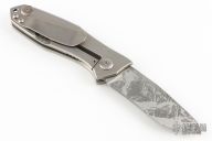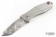 This framelock flipper by Steve Ryan features a satin splatter finished asymmetrically ground blade with a 1/2" sharpened top edge and a fuller. The handle has a two-tone finished titanium frame with a matching tip up titanium clip. Nice detent, blade seating and lockup. Has some light scratches, excellent condition otherwise.