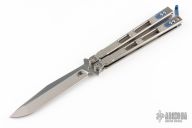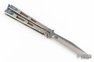 This Nieves Balisong by Hinderer features a stonewash finished blade. The handle has stonewashed titanium handles with anodized titanium filler tabs and T-latch. Comes with original box. Excellent condition.