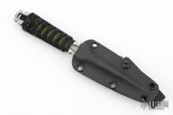 Reminiscent of the classic V-42 dagger, the blade also has “thumb print” recesses on both sides that do double duty as retention points for the knife’s custom-molded Kydex sheath. The sheath comes complete with a snap-fastened inside-the-waistband loop, but its grommet pattern also makes it easily adaptable to many other styles of carry.