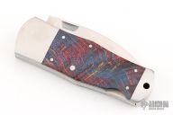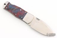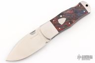This knife features a satin finished drop point blade. The handle has steel bolsters and liners with rag micarta scales. Has some light scratches otherwise the knife is in excellent condition.