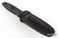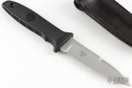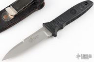 This M-10 by Gryphon Knives is a Bob Terzuola design, it has a bead blasted spear point blade with false top edge and notched thumbrest, .196" blade stock and .919" blade depth, hidden tang construction. The handle has a black FRN grip with lanyard hole. Comes with a black leather sheath with metal clip. Has some light scuffs, otherwise excellent condition.