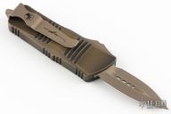 This Troodon Mini OTF automatic by Microtech knives features a bronze apocalyptic finished double edged blade, and a bronzed apocalyptic aluminum handle with bronze apocalyptic finished hardware, tip down clip, and glass breaker. S/N 023. Dated 05/2021. Comes with original box and papers. Excellent condition.