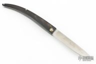 This knife by Mike Mann, features a satin finished drop point blade. The handle has horn covers, stainless spring and liners. Comes in a soft pouch with original papers. Has some patina, excellent condition otherwise.