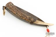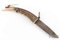 This Ring Pull by Idaho Knife Works features a satin finished blade. The handle is a piece of stag antler tine with steel spring, brass ring and fittings. Solid lockup, nice blade seating. Comes with a soft pouch. Has some scratches and patina, otherwise excellent condition. Pretty cool knife! Comes with COA dated Jan 2007.