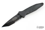 This Socom Elite manual linerlock folder by Microtech Knives has a black chisel ground partially serrated tanto blade with notched thumbrest and dual thumbstuds. Has a black aluminum handle with non-slip inlays, tip down black stainless steel clip, all black hardware. Serial number 00317 and dated 11/2006. Comes with original box, sheath and papers. Excellent condition.