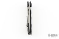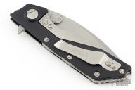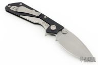 This DOC framelock flipper is a collaboration between A. Marfione and M. Strider, their names are on the clip. The blade is bead blasted with a standard edge, dual thumb-studs, flipper and a notched thumbrest. The handle is black aluminum with non-slip inserts, and a bead blast stainless steel clip, tip up carry. Dated 02/2015 and serial number 2133. Has a light scuff on the blade, otherwise excellent condition. Comes with original box and papers.