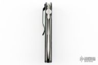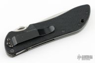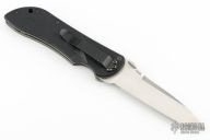 This Stryker by Benchmade has a satin finished tanto blade with notched thumbrest and a thumbdisc. The handle features black G10 scales over titanium liners, stainless steel clip, tip down carry. Comes in a Benchmade drawstring pouch with broken slider. Has some scratches and a weird wear mark on the frame, has been resharpened, good user condition.