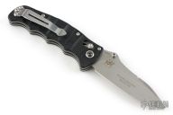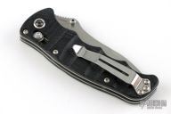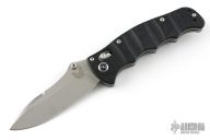 This 484 Nakamura AXIS features a drop point blade with swedge, dual thumb studs and notched thumb rest. The handle is comprised of machined black G10 scales over steel liners and barrel spacers. The steel tip up clip is reversible for right or left hand carry. Comes in a Benchmade drawstring pouch. Has a couple light scuffs and scratches, excellent condition otherwise.