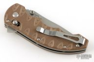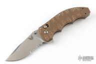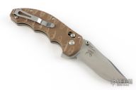This Axis Lock flipper is a Ball Custom Knives Design executed by Benchmade. The tumble finished clip point blade has a swedge, dual thumb studs, notched thumbrest and flipper. The handle is comprised of sculpted tan and brown G10 scales over skeletonized steel liners and standoffs. AXIS locking mechanism. Comes in a Benchmade drawstring pouch with broken clasp. Excellent condition.