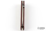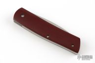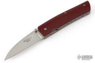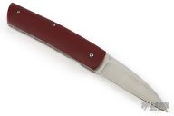 This linerlock folder by Eldon Peterson features a hand rub satin finished blade with a single thumbstud. The handle has red linen micarta scales, titanium liners with jeweled interiors, stainless steel backspacer. Nice detent and lockup. Comes with a zippered case. Has a few light scratches, otherwise excellent condition.