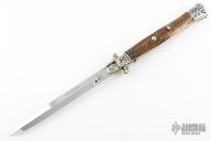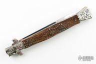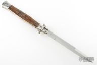 This 25" Picklock Auto by Renzo Passcotto features a mirror finished bayonet ground blade with false edges. The handle has nickel silver bolsters, stag scales, brass liners and stainless steel backspacer. Has safety. Excellent condition. Comes with a felt bag. #22 of 30. Only two were made in stag. This one has been engraved by Luca Bertella.