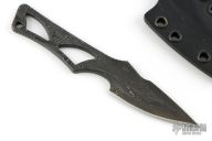 Enyo - a fitting name for this knife, Enyo, was an ancient goddess of war, acting as a counterpart and companion to the war god Ares. This companion knife can be worn around the neck or in a pocket / inside the waist band (IWB). The Enyo’s design makes it a comfortable everyday carry fixed blade with great ergonomics. Enyo is perfectly suited for daily cutting tasks, and is always ready to assist the user. The form fitted Kydex sheath comes with a para-cord sheathed neck chain and IWB loop for convenient carry options. Pewter Spartan helmet bead on lanyard. This Enyo is composed of Damascus and includes a black Kydex sheath. .187" blade stock and 1.084" blade depth. Has some patina, excellent condition otherwise.