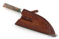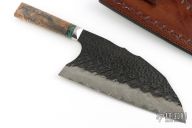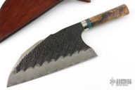 This Kitchen Chopper/Cleaver by Benjahmin Knives features a Damascus blade with forge finished flats and false top edge, .128" blade stock and 3.826" blade depth, hidden tang construction. The handle is indexed for a right handed user. The handle has a stainless steel guard, spalted maple grip with a mosaic pin, black and mammoth tooth spacers. Comes with a hand tooled brown leather sheath and original box. New from maker.