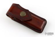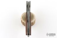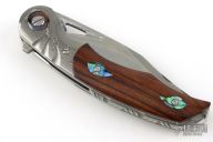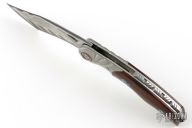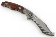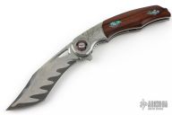This linerlock flipper by Benjahmin Knives features a San Mai Damascus blade with thumbhole and flipper. The handle has Damascus fileworked bolsters with timascus pivot collars, desert ironwood scales with abalone inlays, stonewashed stainless steel liners, fileworked stainless steel backspacer with lanyard hole. Rides on bearings, nice detent, lockup and blade seating. Comes with a hand tooled brown leather belt sheath and original box. New from maker.
