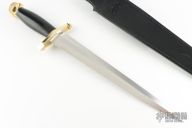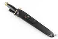 This Model 13-12 Arkansas Toothpick by Randall Made Knives features a satin finished carbon steel double edged blade with .185" blade stock and 1.602" blade depth, hidden tang construction. The handle has a lugged brass guard and scalloped butt, black linen micarta grip with black/brass spacers. Comes with a black leather sheath and a zippered case. Excellent condition.
