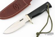 The Model 28 by Randall Made Knives is an excellent skinning and outdoors knife. Has a satin finished drop point blade with false top edge and notched thumbrest, stainless steel blade, .160" blade stock and 1.189" blade depth, full tang construction. The handle has a brass guard, black linen micarta handle and a lanyard hole at the butt. Comes with brown leather sheath. Has some light scratches, otherwise excellent condition.
