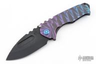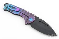 This Praetorian T frame lock folder by Medford Knives has a black PVD finished blade with dual thumb studs and fullers. Handle has a titanium frame with "stained glass" finish handle D2 backspacer and tip up titanium clip. Anodized titanium pivot. Blade is centered when closed, nice lockup and detent. This frame lock comes in the original box, hard case and paperwork dated November 14, 2018. Excellent condition.
