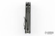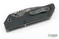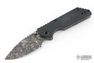 This AR folder by Strider features a Digicam drop point blade with dual thumbstuds and a notched thumbrest. The handle has textured G10 scales, tumbled titanium liners and flamed tip up clip. Notches on thumbrest, lockup and rear of handle. Has some light scuffs, otherwise excellent condition.
