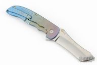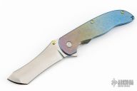 This Norseman (#6715) by John Grimsmo features a stonewashed blade with a single anodized titanium thumb stud, notched thumb ramp and flipper. The handle has a smooth stonewashed and anodized (blue w/ ice blue to pink flakes) titanium frame with anodized titanium screws. Has a matching clip with hidden screws. Very smooth action that requires no wrist movement. Nice detent, lockup and blade seating. Rides on ceramic bearings. Comes with original hard case, Nano-Oil, tool, and COA dated February 14, 2023. Excellent condition.