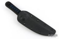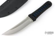 This Fixed Blade by Josh Mason features a satin finished up swept blade with .187" blade stock, 1.314" blade depth with hidden tang construction. The handle has a Turk's head Paracord knot as a guard, and a wrapped handle. Blue stingray underlay. Comes with a Kydex sheath. New from maker!