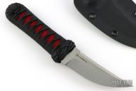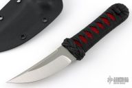 This Fixed Blade by Josh Mason features a satin finished up swept blade with .187" blade stock, 1.170" blade depth with hidden tang construction. The handle has a Turk's head Paracord knot as a guard, and a wrapped handle. Red stingray underlay. Comes with a Kydex sheath. New from maker!