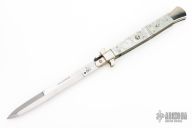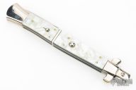 This 25" Picklock Auto by Renzo Passcotto features a mirror finished bayonet ground blade with false edges. The handle has nickel silver bolsters, mother of pearl scales with nickel silver spacers, brass liners and stainless steel backspacer. Has safety. Excellent condition. Comes with a cloth bag. #18 of 30. Only two were made in mother of pearl.