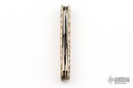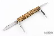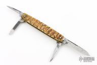 This antique slipjoint by E.T. Allen San Francisco was made between 1878-1899. One of the blades is marked "Spiral Cutlery". It features satin finished blades with nail nicks. The handle has nickel silver bolsters, jigged bone covers, brass liners and steel springs. Comes with a zippered case. Has some scratches and oxidation, has been resharpened, otherwise good condition for its age.