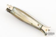 This Fish Picklock by AKC Italy features a mirror polished clip point blade. The handle has nickel silver bolsters and butt, honey horn scales, brass liners and a stainless steel backspacer. Has safety. Excellent Condition.