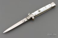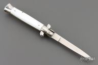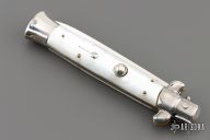 This auto features a mirror polished drop point Blade. Nickle silver guard and rear bolster and pearlx scales as well as brass liners. Nice function, strong firing. Has some light scratches and patina, otherwise excellent condition.