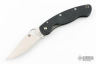 This Military Liner Lock by Spyderco has a satin finished clip point blade with notched thumbrest and thumbhole. Handle is black G10, with stainless steel single liner (lock), black fiber back spacer, stainless steel tip down clip, and lanyard tube pin. Excellent condition. Comes with original box and papers.