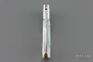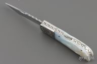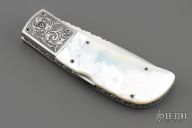 This hidden button release D/A auto from A.A. Sanders features a mirror polished drop point blade with file worked spine and a nail nick. The handle has dovetailed and engraved stainless steel bolsters, mother of pearl scales, over stainless steel liners and fileworked backspacer. Has some light scratches, otherwise excellent condition. Comes with a zippered case.