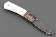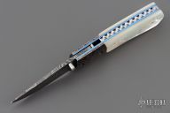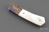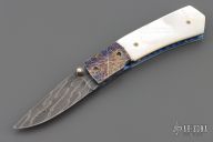 This knife by Mike Dilluvio features a mosaic Damascus blade with single thumbstud with stone inlay. The handle has a blued mosaic Damascus dovetailed bolsters, presentation grade mother of pearl scales, anodized titanium liners, fileworked stainless steel backspacer. Nice detent, blade seating and lockup. Has some light scratches and minor wear on the bolster finish, otherwise good condition.