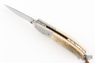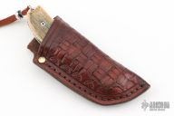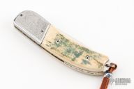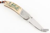 This knife by Mike "Whiskers" Allen features a mirror polished blade with single thumbstud with black lip pearl inlay and fileworked spine. The handle has stippled dovetailed stainless steel bolsters, mammoth ivory scales, fileworked screws, anodized and fileworked titanium liners, fileworked stainless steel backspacer with lanyard bail. Comes with a hand tooled brown leather sheath and COA. Nice detent, lockup and blade seating. Has some light scratches, otherwise excellent condition.