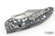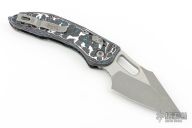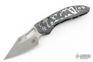 This Stitch RAM-LOK by Microtech has a stonewashed blade with notched thumbrest and a thumbhole. The handle has CUSTOM fat carbon scales with blasted stainless steel hardware and tip up clip. Comes with original box and papers. Excellent condition. Dated 10/2023.