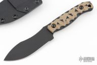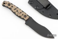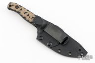 This Knife by Half Face Blades features a black blade with a notched thumbrest, .097" blade stock, 1.226" blade depth, full tang construction.  The handle has black/coyote brown G-10 scales.  Comes with a kydex sheath with clip. Excellent Condition.