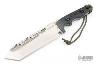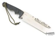 This AirKat Apache from Dwaine Carrillo features a satin finished tanto blade with sawteeth on top edge and notched thumbramp, .267" blade stock and 2.074" blade depth, full tang construction. The handle is comprised of black G10 scales. Lanyard hole in pommel with lanyard. Has a couple light scratches, otherwise excellent condition.