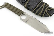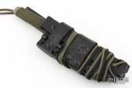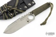 This AirKat from Dwaine Carrillo features a bead blast finished blade with notched thumbrest and sharpened top edge, finger ring, .258" blade stock and 1.484" blade depth. The handle is comprised of paracord over full tang construction. Lanyard hole in pommel with lanyard. Has some light spots on the blade, otherwise excellent condition. Comes with black leather sheath with paracord wrap.