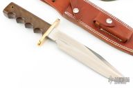This Model 14 from Randall Made Knives features a satin finished blade with sharpened top edge, .213" blade stock and 1.418" blade depth, full tang construction. The handle has a brass guard and green linen micarta grip. Comes with a brown leather sheath. Excellent condition.
