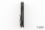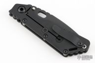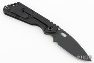 This Mick Strider Performance Series SMF framelock folder features a black finished spear point blade with thumbhole and notched thumbrest. The handle has a black titanium frame with titanium clip, tip up carry. Jimping on blade spine. Includes Hinderer "Lock Bar Stabilizer" for maximum reverse lock retention. Nice detent, lockup and blade seating. New condition.