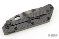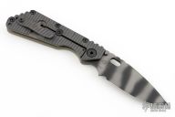 This SMF framelock folder by Mick Strider features a tiger stripe finished drop point blade and a dimple pattern aluminum and flamed titanium frame and tip up titanium clip. Includes a "Lock Bar Stabilizer" for maximum reverse lock retention. Nice detent, lockup and blade seating. New condition.