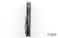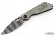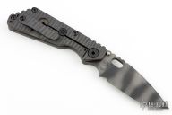 This Mick Strider SNG Fatty framelock folder features a tiger stripe blade with thumbhole and notched thumbrest. The handle has a gray aluminum and flamed titanium frame with titanium clip, tip up carry. Jimping on blade spine. Nice lockup, detent, and blade seating. New condition.
