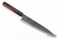The is a long narrow kitchen knife with a thick blade made from Stainless Clad Aogami Super Steel (NAS) which is a high-carbon steel alloy with vanadium and is ground on both sides. As with all of Takeda's knives, it has a strong sharp edge. The octagon shaped wood handle is easy to hold. 209mm cutting edge, .135" blade stock and 1.616" blade depth. Brand new from maker.