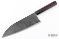 The Gyuto by Takeda is traditionally used for cutting a head of cabbage or slicing meat. The blade is stainless clad Aogami Super Steel (NAS) which is a high-carbon steel alloy with vanadium, .108" blade stock and 2.578" blade depth, hidden tang construction. As with all of Takeda's knives, it has a strong sharp edge. The octagon shaped wood handle is easy to hold. 215mm cutting edge. Comes with original box. New from maker!