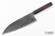 The Gyuto by Takeda is traditionally used for cutting a head of cabbage or slicing meat. The blade is stainless clad Aogami Super Steel (NAS) which is a high-carbon steel alloy with vanadium, .101" blade stock and 2.508" blade depth, hidden tang construction. As with all of Takeda's knives, it has a strong sharp edge. The octagon shaped wood handle is easy to hold. 216mm cutting edge. Comes with original box. New from maker!
