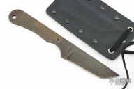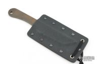 This knife by Ricky Fowler features a black blade with .125" blade stock and 1.003" blade depth, full tang construction with skeletonized handle. Comes with a kydex sheath. Has a couple light scuffs, otherwise Excellent condition. #1702