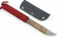 This Long Kiridashi by John Fitch features a chisel ground blade with .252" blade stock and .705" blade depth, hidden tang with cord wrapped handle. Comes with kydex sheath. Has scuffs, scratches, rust and spotting. Fair condition.